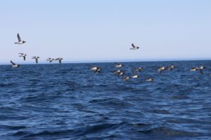 Things did not look promising at the onset, for we never saw so much as a gull when we put to sea on Thursday. But by Friday there were quite a few ‘Gannets’ diving for bait. Saturday brought great flocks of ‘Turres’ and ‘Puffins’ returning to their nests with beaks full of caplin, the cod’s bellies were full, and we spotted a feasting ‘Minke’ whale. On Sunday the place exploded as dozens of Humpbacks cruised the shores – blowing, breaching and frolicking in the smorgasbord of caplin that we hoped to share.