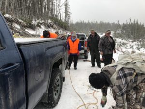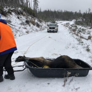 In the meantime, a retired trapper pulled up on his quad, stopping long enough to offer a snow sledge that was stored at his nearby camp, returning the exact moment the crowd from town arrived to help “shore things up”. All hands finished their day at the butcher’s shop where the moose was skinned and stored before 2 in the afternoon. Just in time for “Tea”